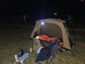 キャンプ初心者あるあるで、フライシートもかけず寝たのが失敗であったのですが、さらにコットを期待しすぎてました。地面からの冷気はコットプラス高級シェラフでもさえぎれず、少し寝ては起き少し寝て起きの繰り返し。